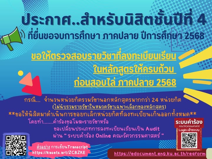 ประกาศรายชื่อนิสิตที่ได้รับประกาศเกียรติคุณและรางวัลสำหรับนิสิตเรียนดีเยี่ยม ประจำปีการศึกษา 2565 อ่านเพิ่มเติม »