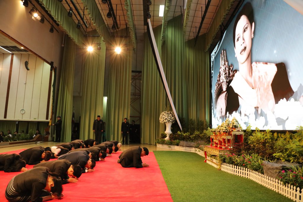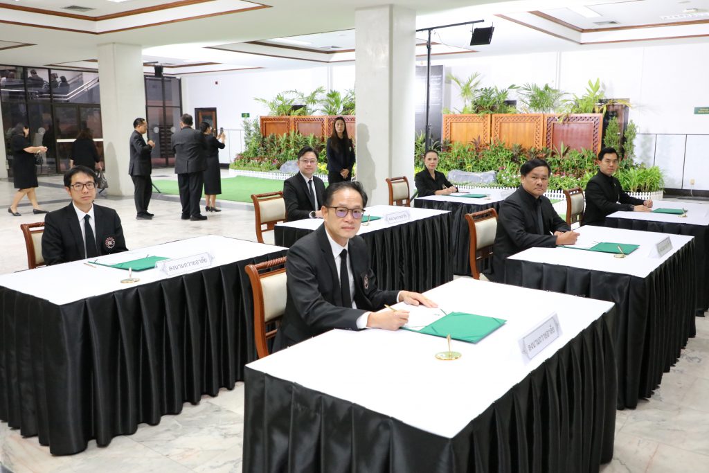 ภายในพิธี ประกอบด้วย การฉายวิดีทัศน์พระมหากรุณาธิคุณที่ทรงมีต่อมหาวิทยาลัยเกษตรศาสตร์ นิสิตอ่านบทกลอนเพื่อน้อมรำลึกในพระมหากรุณาธิคุณ พิธีกราบน้อมถวายอาลัยหน้าพระฉายาลักษณ์ การยืนสงบนิ่งถวายความอาลัย และการลงนามถวายอาลัย