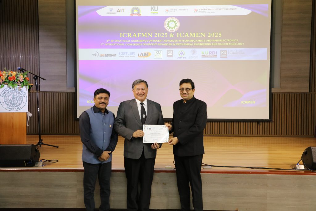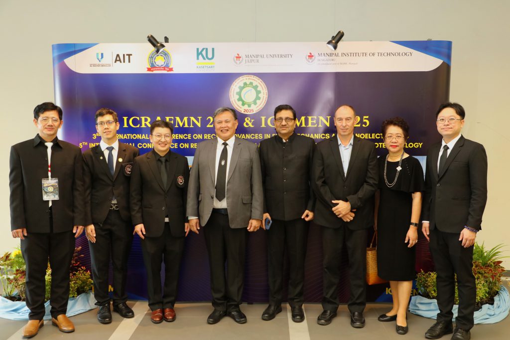 เมื่อวันที่ 29 ตุลาคม 2568 คณะวิศวกรรมศาสตร์ โดยภาควิชาวิศวกรรมเครื่องกล จัดการประชุมวิชาการนานาชาติ The 3rd International Conference on Recent Advances in Fluid Mechanics and Nanoelectronics and The 5th International Conference on Advances in Mechanical Engineering and Nanotechnology (ICRAFMN&ICAMEN-2025) โดยมีวัตถุประสงค์เพื่อเป็นเวทีแลกเปลี่ยนองค์ความรู้ทางวิชาการและงานวิจัยล่าสุด ระหว่างนักวิจัย นักวิชาการ นิสิต และนักศึกษาจากสถาบันต่างประเทศ ในด้านความก้าวหน้าล่าสุดในกลศาสตร์ของไหลและนาโนอิเล็กทรอนิกส์ และมีการนำเสนอผลงานผลงานทางวิชาการกว่า 200 ผลงาน โดยมี รศ.ดร. วีรชัย ชัยวรพฤกษ์ หัวหน้าภาควิชาวิศวกรรมเครื่องกล กล่าวต้อนรับผู้ร่วมงาน ศ.ดร.วันชัย ยอดสุดใจ คณบดีคณะวิศวกรรมศาสตร์ กล่าวรายงาน และมี ดร.ดำรงค์ ศรีพระราม รักษาการแทนอธิการบดีมหาวิทยาลัยเกษตรศาสตร์ กล่าวเปิดงาน รวมทั้ง Prof. Dr. Niti Nipun Sharma อธิการบดี Manipal University Jaipur (MUJ) ประเทศอินเดีย ให้เกียรติกล่าวสุนทรพจน์ ตลอดจนการกล่าวแสดงความยินดีจากผู้แทนจากสถาบันการศึกษาชั้นนำ เช่น มหาวิทยาลัย MUJ สถาบันเทคโนโลยี MIT มหาวิทยาลัย NIT และมหาวิทยาลัย UMP-SA มีคณะผู้บริหาร คณาจารย์ นักวิชาการ นักวิจัย ตลอดจนบุคลากรและนิสิตจากทั้งสองหน่วยงานร่วมในพิธีที่จัดขึ้น ณ ห้องประชุม ชั้น 19 ภาควิชาวิศวกรรมเครื่องกล (อาคาร 6) คณะวิศวกรรมศาสตร์