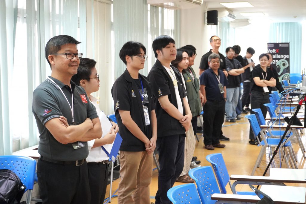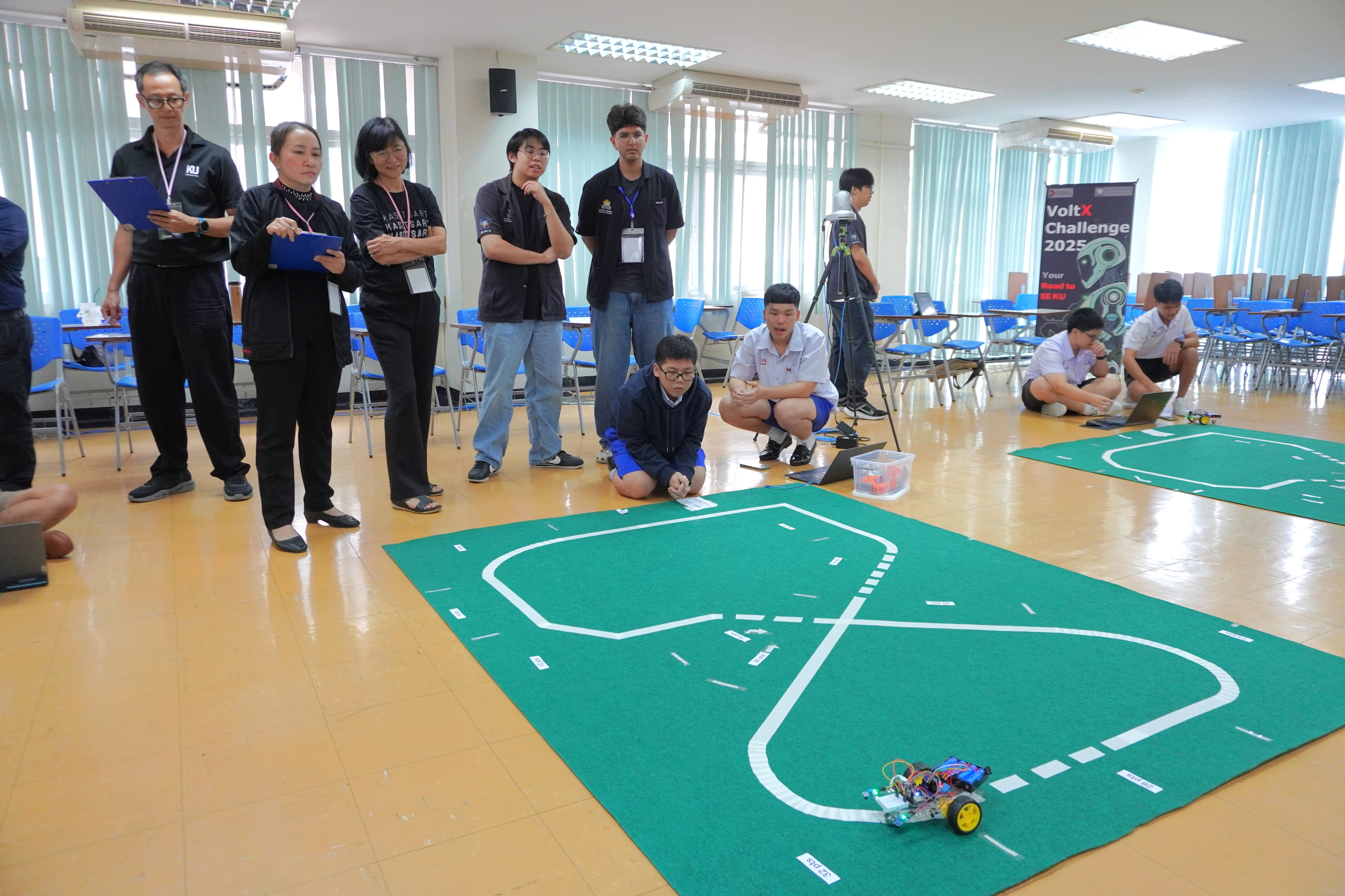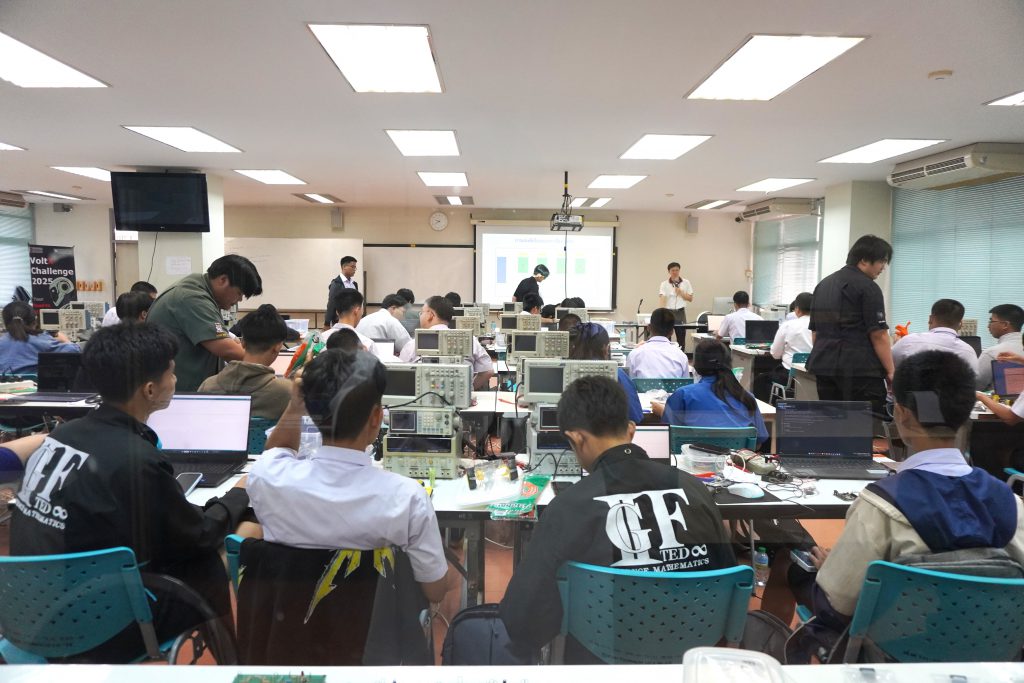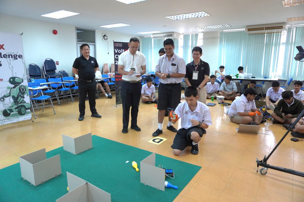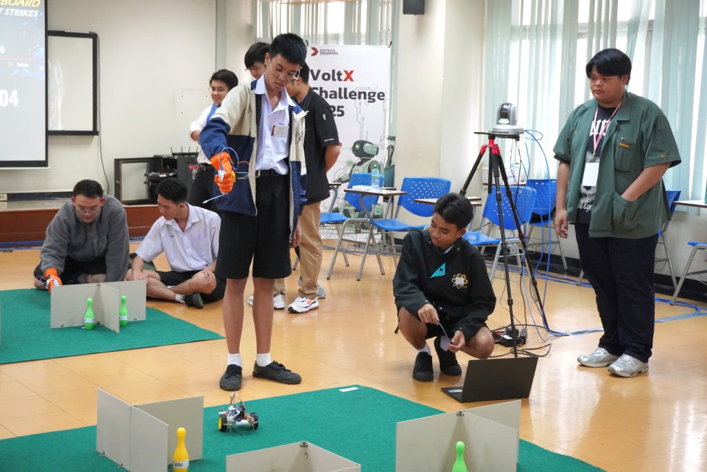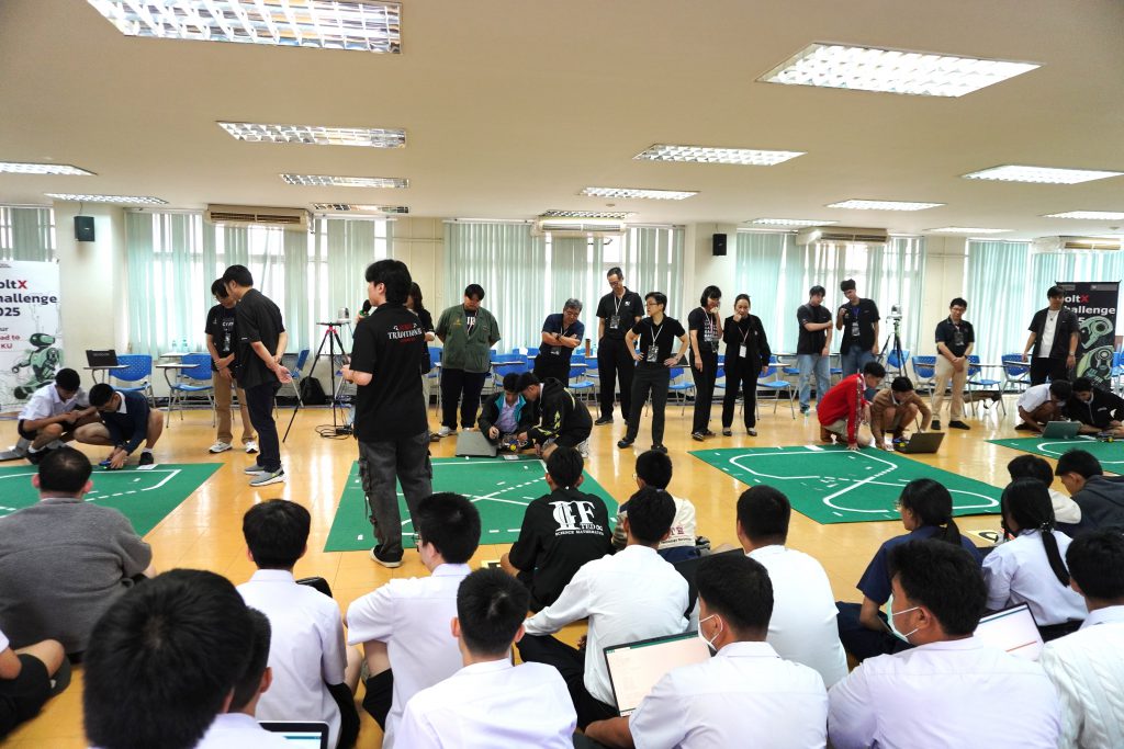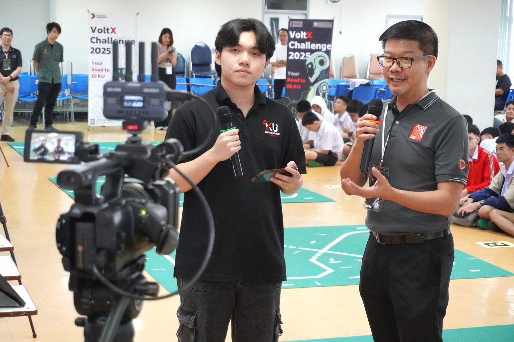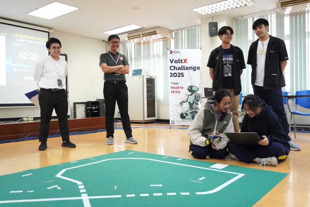 ภาควิชาวิศวกรรมไฟฟ้า จัดกิจกรรมการแข่งขันสุดยอดนวัตกรรม “VoltX Challenge 2025: Gesture-Controlled Mobile Robot with Challenging Missions 2025″ ภายใต้โครงการ “EE Future Sparks 2025: จุดประกายไฟสู่เส้นทางวิศวกรไฟฟ้า” ในรอบคัดเลือกอย่างเข้มข้น โดยมี รศ.ดร. ศิริโรจน์ ศิริสุขประเสริฐ หัวหน้าภาควิชาวิศวกรรมไฟฟ้า เป็นประธานเปิดการแข่งขัน และมีทีมนักเรียนชั้นมัธยมศึกษาปีที่ 5 – 6 จากโรงเรียนต่าง ๆ เข้าร่วมการแข่งขัน จำนวน 36 ทีม จัดขึ้นระหว่างวันที่ 1-2 พฤศจิกายน 2568 ณ ภาควิชาวิศวกรรมไฟฟ้า คณะวิศวกรรมศาสตร์ มหาวิทยาลัยเกษตรศาสตร์ (มก.) โดยทีมนักเรียนผู้เข้าร่วมการแข่งขัน ได้นำความรู้และทักษะที่ได้รับจากการเข้าร่วมอบรมเชิงปฏิบัติการด้านพัฒนาหุ่นยนต์ที่จัดโดยภาควิชาวิศวกรรมไฟฟ้าเมื่อวันที่ 18 และ 25 ตุลาคม 2568 ที่ผ่านมา ประยุกต์ใช้ในการแข่งขัน ทั้งด้านการพัฒนาและโปรแกรมหุ่นยนต์ การทำงานเป็นทีม ตลอดจนการแก้ไขปัญหาเฉพาะหน้า