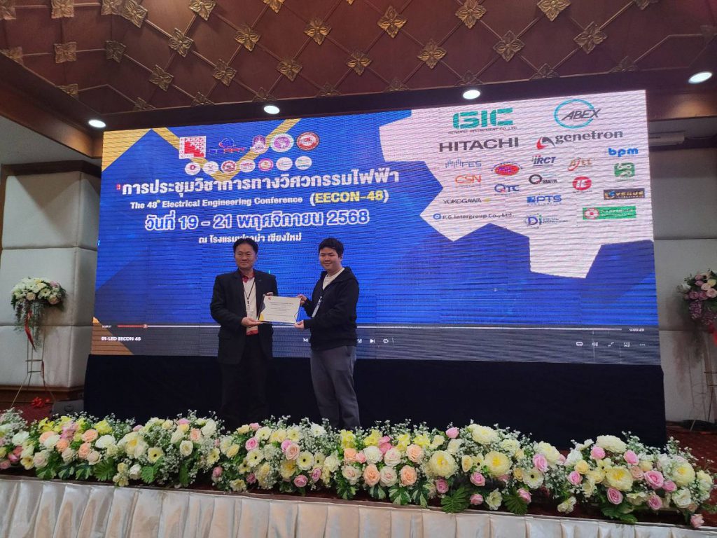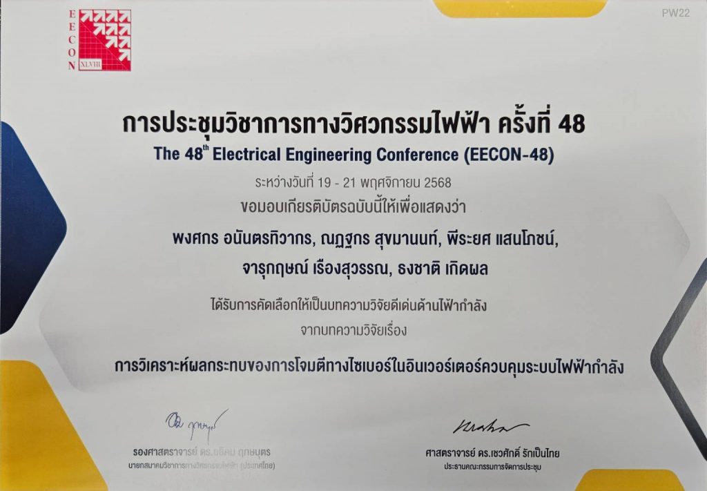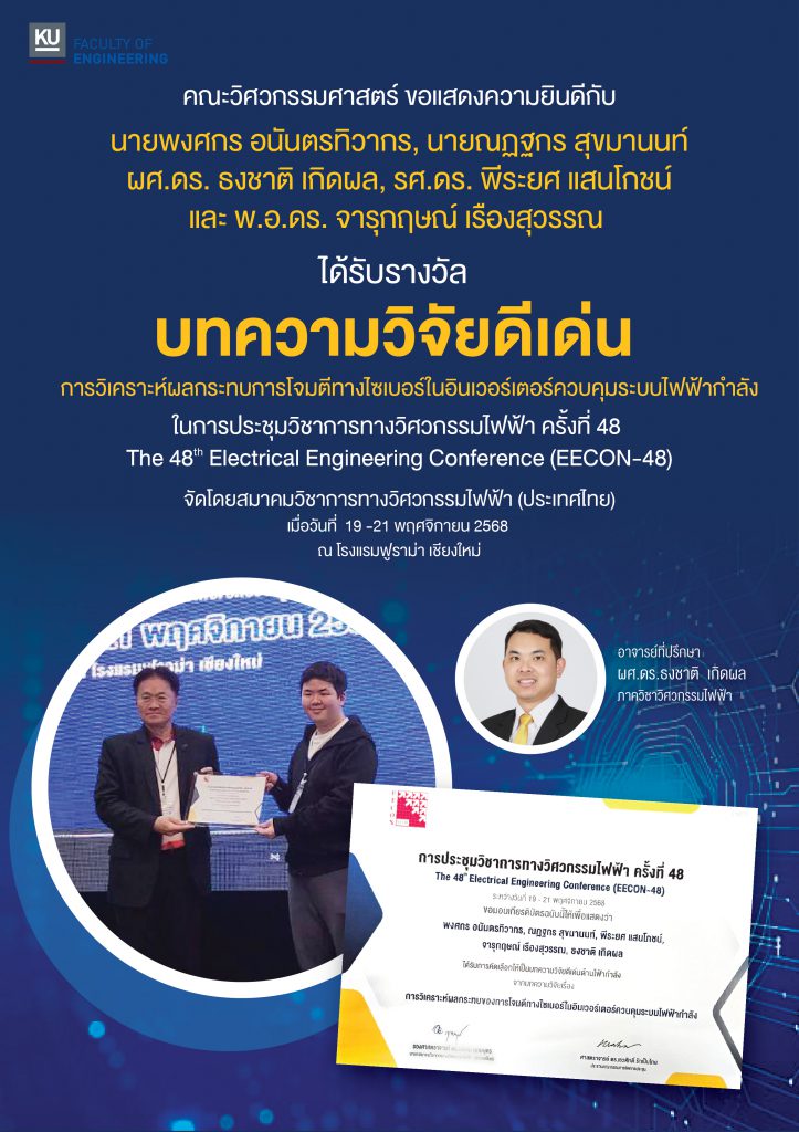 อาจารย์และนิสิตภาควิชาวิศวกรรมไฟฟ้า ได้รับรางวัลบทความวิจัยดีเด่น ด้านไฟฟ้ากำลัง จากบทความวิจัยเรื่อง การวิเคราะห์ผลกระทบการโจมตีทางไซเบอร์ในอินเวอร์เตอร์ควบคุมระบบไฟฟ้ากำลัง ในการประชุมวิชาการทางวิศวกรรมไฟฟ้า ครั้งที่ 48 The 48th Electrical Engineering Conference (EECON-48) จัดโดยสมาคมวิชาการทางวิศวกรรมไฟฟ้า (ประเทศไทย) ระหว่างวันที่ 19 -21 พฤศจิกายน 2568 ณ โรงแรมฟูราม่า เชียงใหม่