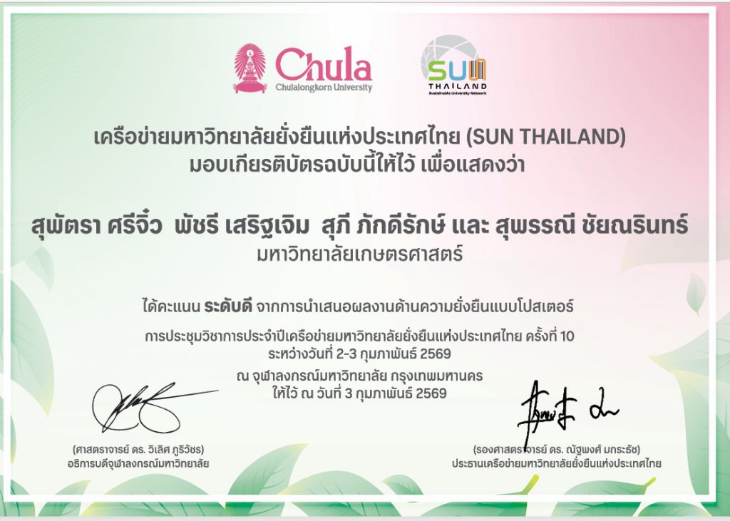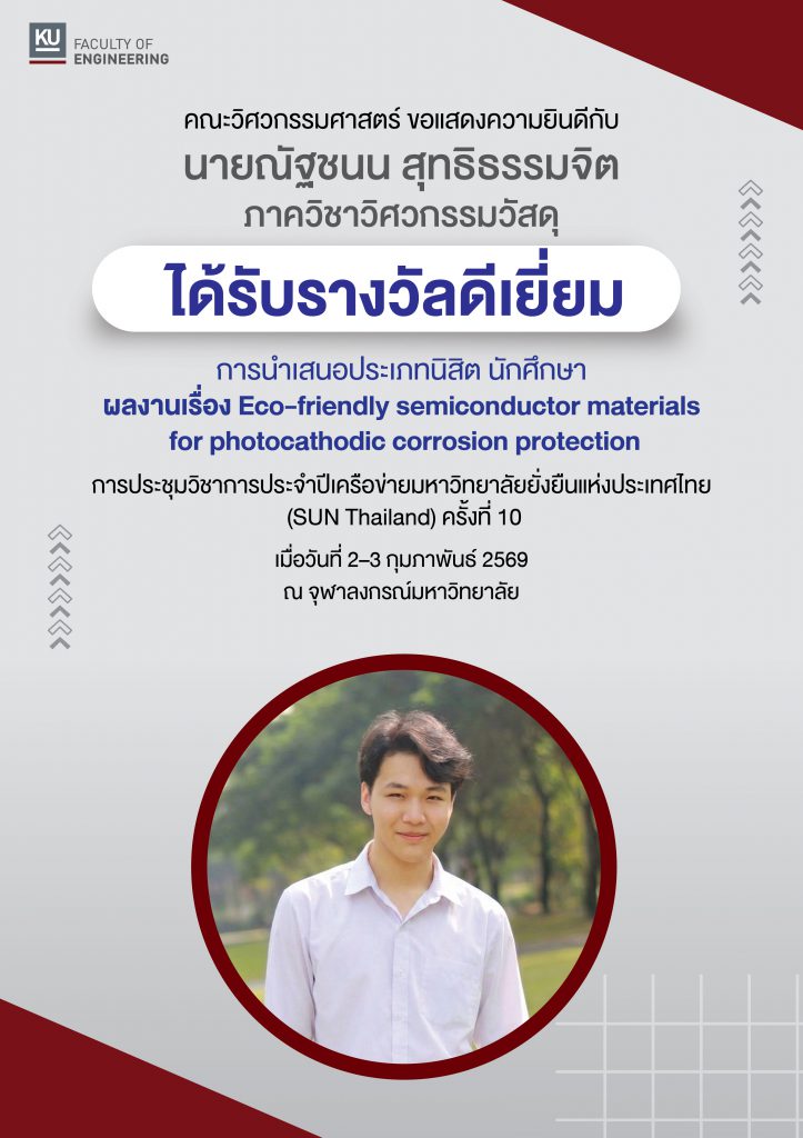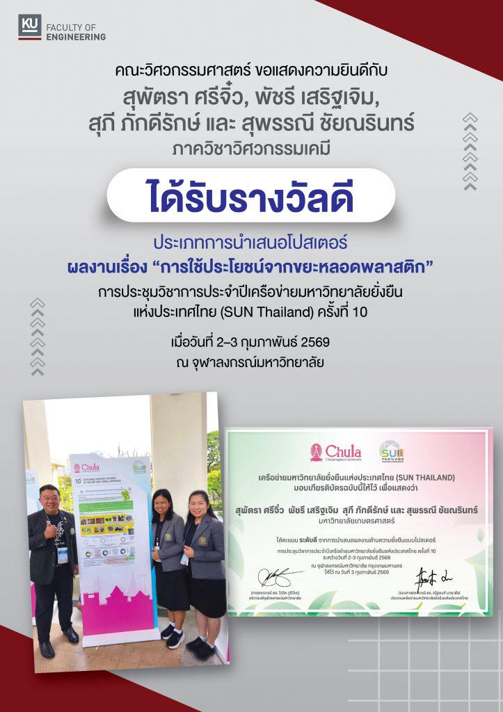 ประกอบด้วย น.ส.สุพัตรา ศรีจิ๋ว นางพชรี เสริฐเจิม นางสุภี ภักดีรักษ์ และ น.ส.สุพรรณี ชัยณรินทร์ ได้รับรางวัลดี ประเภทการนำเสนอโปสเตอร์ จากผลงานเรื่อง การใช้ประโยชน์จากขยะหลอดพลาสติก และนายณัฐชนน สุทธิธรรมจิต นิสิตภาควิชาวิศวกรรมวัสดุ ได้รับรางวัลดีเยี่ยม ประเภทการนำเสนอประเภทนิสิตนักศึกษา จากผลงาน เรื่อง “Eco-Friendly Semiconductor Materials for Photocathodic Corrosion Protection” ในการประชุมวิชาการประจำปีเครือข่ายมหาวิทยาลัยยั่งยืนแห่งประเทศไทย (SUN Thailand) ครั้งที่ 10 จัดขึ้นระหว่างวันที่ 2–3 กุมภาพันธ์ 2569 ณ จุฬาลงกรณ์มหาวิทยาลัย