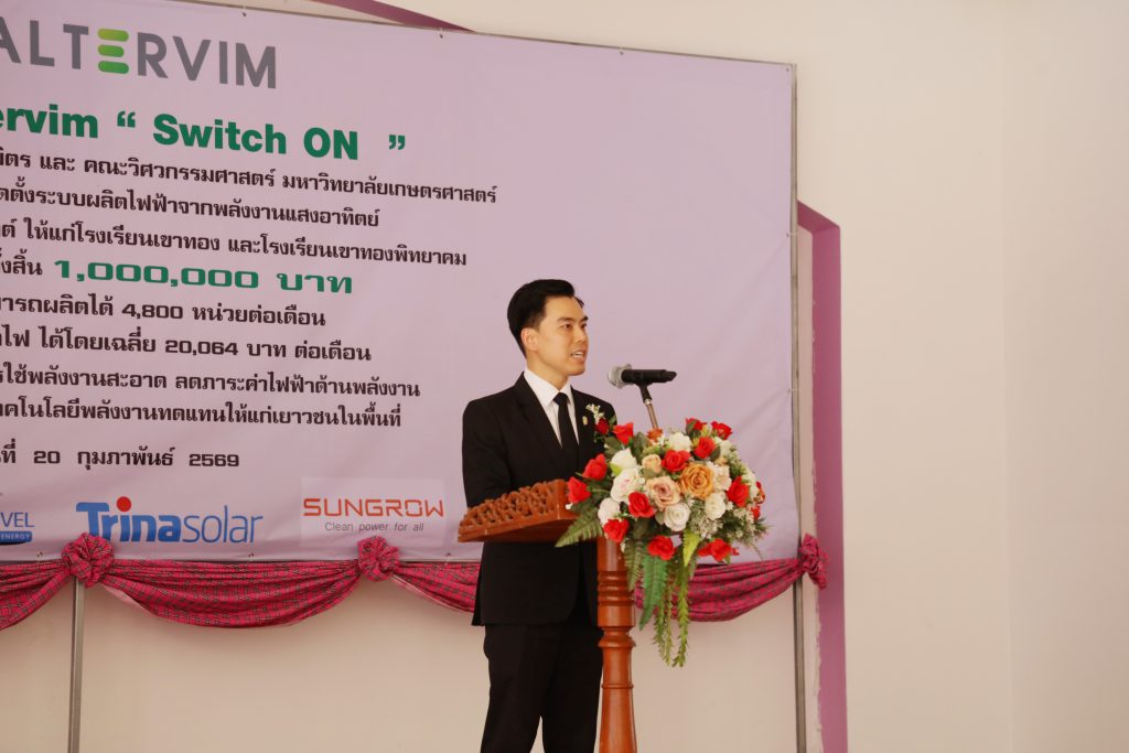 นอกจากนี้ ยังมีพิธีส่งมอบและติดตั้งระบบผลิตไฟฟ้าจากพลังงานแสงอาทิตย์ ขนาดกำลังการผลิต รวม 40 กิโลวัตต์ มูลค่า 1,000,000 บาท (หนึ่งล้านบาทถ้วน) โดยมีคณบดีคณะวิศวกรรมศาสตร์ และประธานเจ้าหน้าที่บริษัท อัลเตอร์วิม จำกัด ร่วมกับพันธมิตร ได้ร่วมส่งมอบระบบและติดตั้งผลิตไฟฟ้าจากพลังงานแสงอาทิตย์ให้แก่โรงเรียนเขาทองและโรงเรียนเขาทองพิทยาคม โดบระบบดังกล่าวสามารถผลิตกำลังไฟได้ 4,800 หน่วยต่อเดือน ช่วยลดค่าไฟ ได้เฉลี่ย 20,064 บาทต่อเดือน โดยมี ผศ.ดร.คเณศ คัจฉสุววรณมณี รองคณบดีฝ่ายทรัพยากรมนุษย์และสื่อสารองค์กร คณะวิศวกรรมศาสตร์ เป็นผู้ประสานงานหลักในการดำเนินการส่งมอบและติดตั้งระบบดังกล่าว และได้รับการสนับสนุนระบบผลิตไฟฟ้าจากพลังงานแสงอาทิตย์จากบริษัท อัลเตอร์วิม จำกัด, บริษัท ไวร์เออ แอนด์ ไวร์เลส จำกัด, บริษัท มาร์เวล โซลาร์ เอ็นเนอร์ยี่ จำกัด, บริษัท Sungrow Power Supply Co.,Ltd., บริษัท เอ็มจีอี พาวเวอร์ จำกัด และบริษัท ฮีลูเคเบิ้ล (ประเทศไทย) จำกัด ร่วมกับพันธมิตร