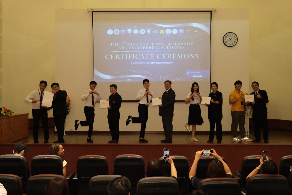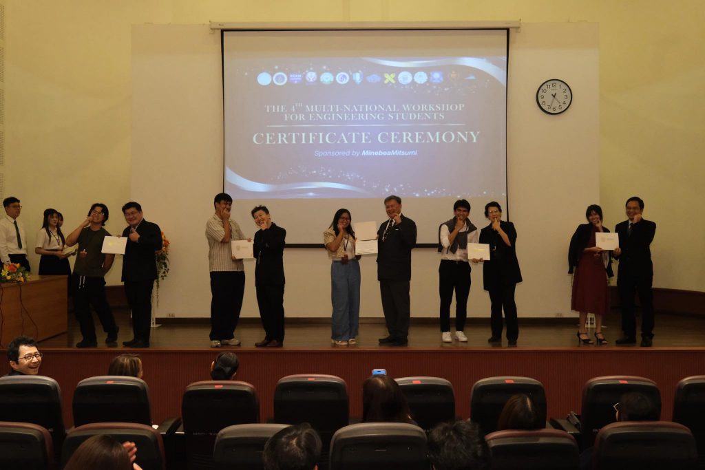พิธีปิดและมอบประกาศนียบัตรจัดขึ้น ณ ห้อง Auditorium ชั้น 4 อาคาร 5 คณะวิศวกรรมศาสตร์ มหาวิทยาลัยเกษตรศาสตร์ โดยศาสตราจารย์ ดร.วันชัย ยอดสุดใจ คณบดีคณะวิศวกรรมศาสตร์ กล่าวแสดงความยินดี และผู้แทนจาก MinebeaMitsumi กล่าวในนามผู้สนับสนุนหลัก