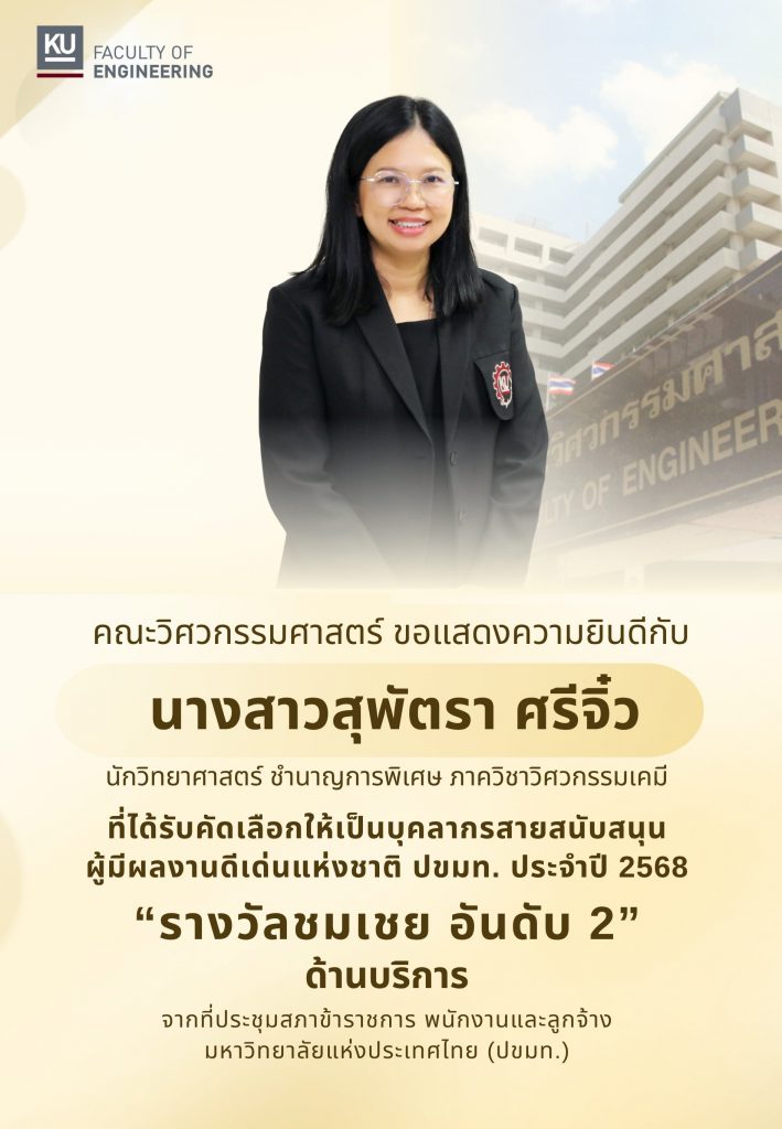 นางสาวสุพัตรา ศรีจิ๋ว นักวิทยาศาสตร์ ชำนาญการพิเศษ ภาควิชาวิศวกรรมเคมี ที่ได้รับคัดเลือกให้เป็นบุคลากรสายสนับสนุน ผู้มีผลงานดีเด่นแห่งชาติ ปขมท. ประจำปี 2568 “รางวัลชมเชย อันดับ 2” ด้านบริการ จากที่ประชุมสภาข้าราชการ พนักงานและลูกจ้างมหาวิทยาลัยแห่งประเทศไทย (ปขมท.)