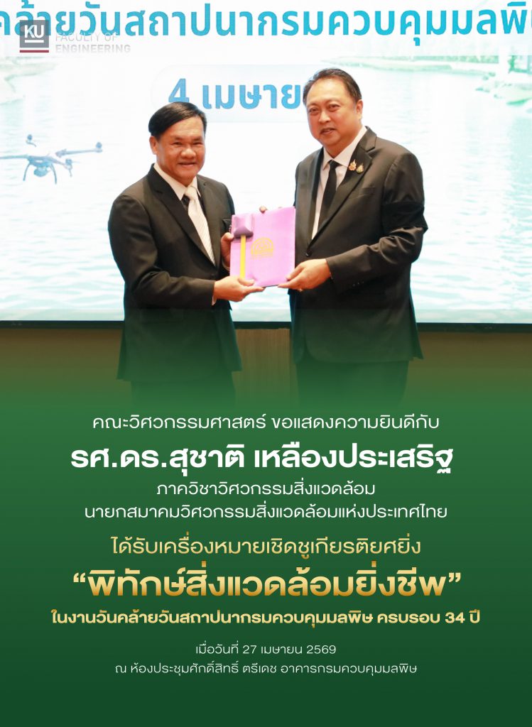 คณะวิศวกรรมศาสตร์ ขอแสดงความยินดีกับ รศ.ดร.สุชาติ เหลืองประเสริฐ อาจารย์ประจำภาควิชาวิศวกรรมสิ่งแวดล้อม และนายกสมาคมวิศวกรรมสิ่งแวดล้อมแห่งประเทศไทย ในโอกาสเข้ารับเครื่องหมายเชิดชูเกียรติยศยิ่งผู้ประกอบคุณงามความดีด้านการส่งเสริมและรักษาคุณภาพสิ่งแวดล้อม “พิทักษ์สิ่งแวดล้อมยิ่งชีพ” จากนายสุชาติ ชมกลิ่น รัฐมนตรีว่าการกระทรวงทรัพยากรธรรมชาติและสิ่งแวดล้อม ในงานวันคล้ายวันสถาปนากรมคบคุมมลพิษ ครบรอบปีที่ 34 เมื่อวันที่ 27 เมษายน 2569 ณ ห้องประชุมศักดิ์สิทธิ์ ตรีเดช อาคารกรมควบคุมมลพิษ